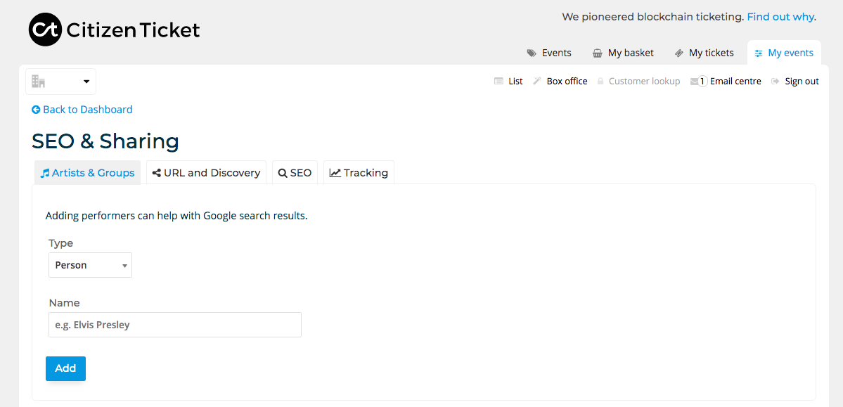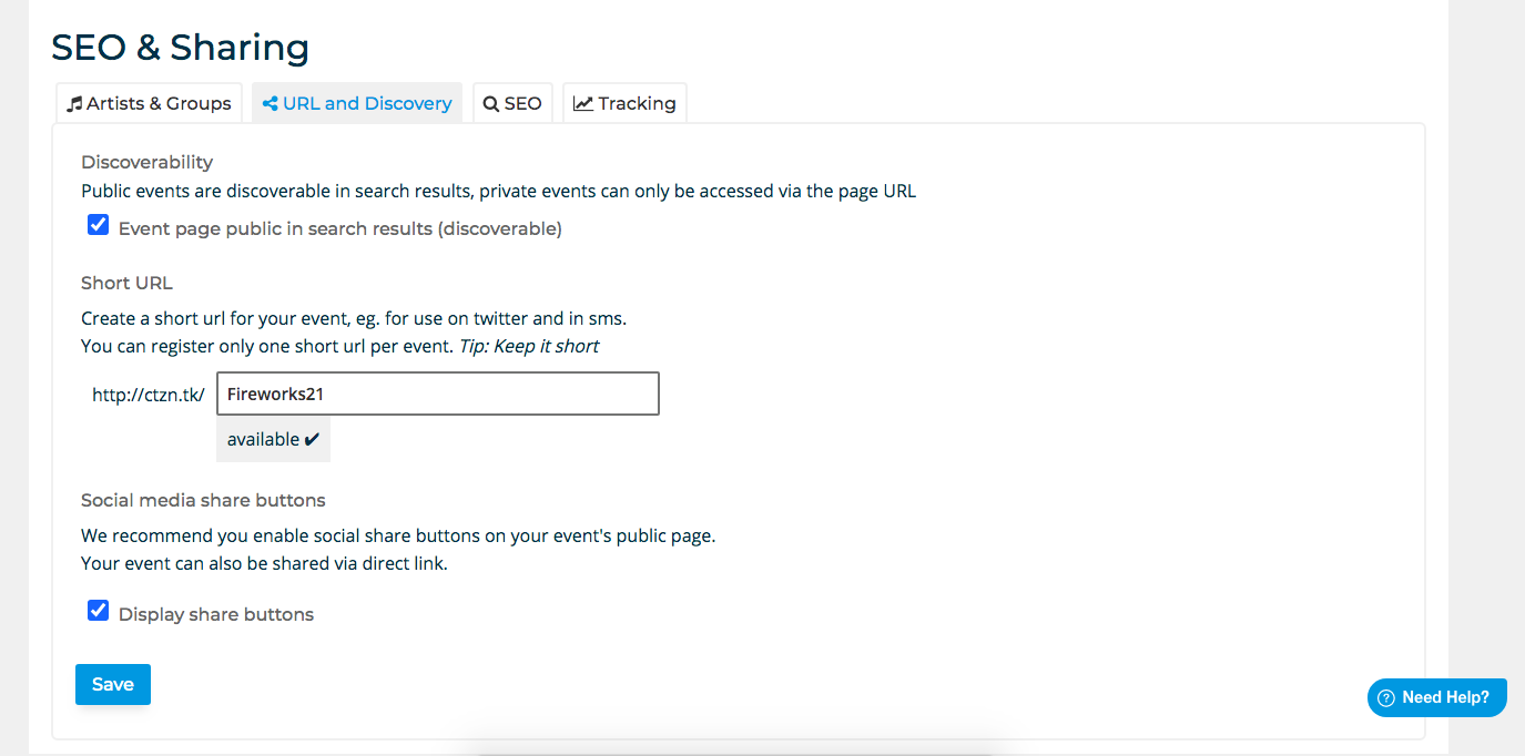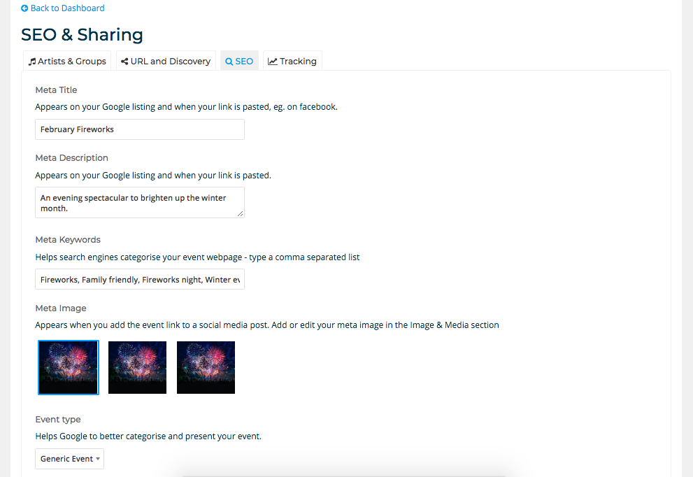 You want your event to be a success and so do we! So it's important to think about your Marketing and who you would like to reach. So we've built in Search Engine Optimising (SEO) and sharing tools into your Event dashboard > Marketing > SEO & Sharing.