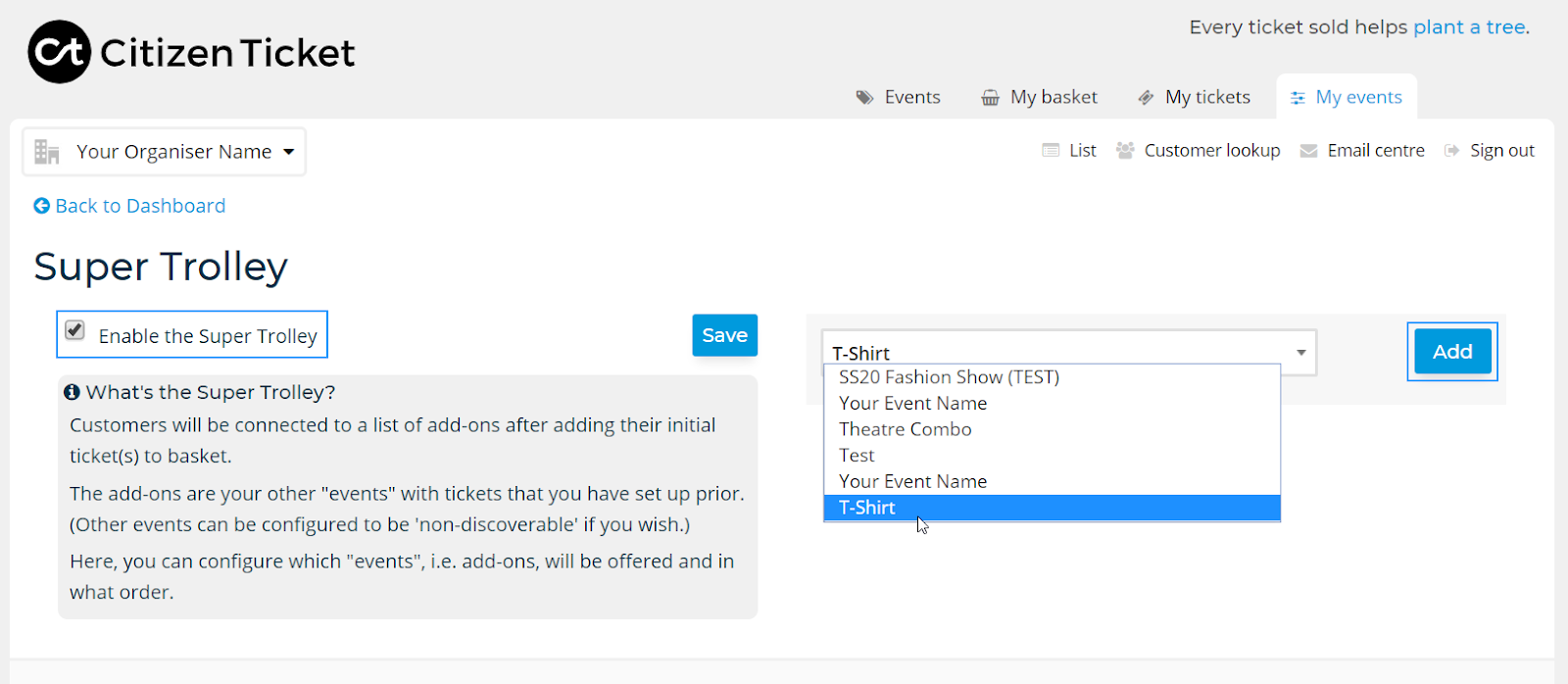 Then head to Admin > Super Trolly > check 'Enable the Super Trolly'. You're then good to select the ticket type you want to use as an "add on". You can disable the Super Trolly feature at any time too.